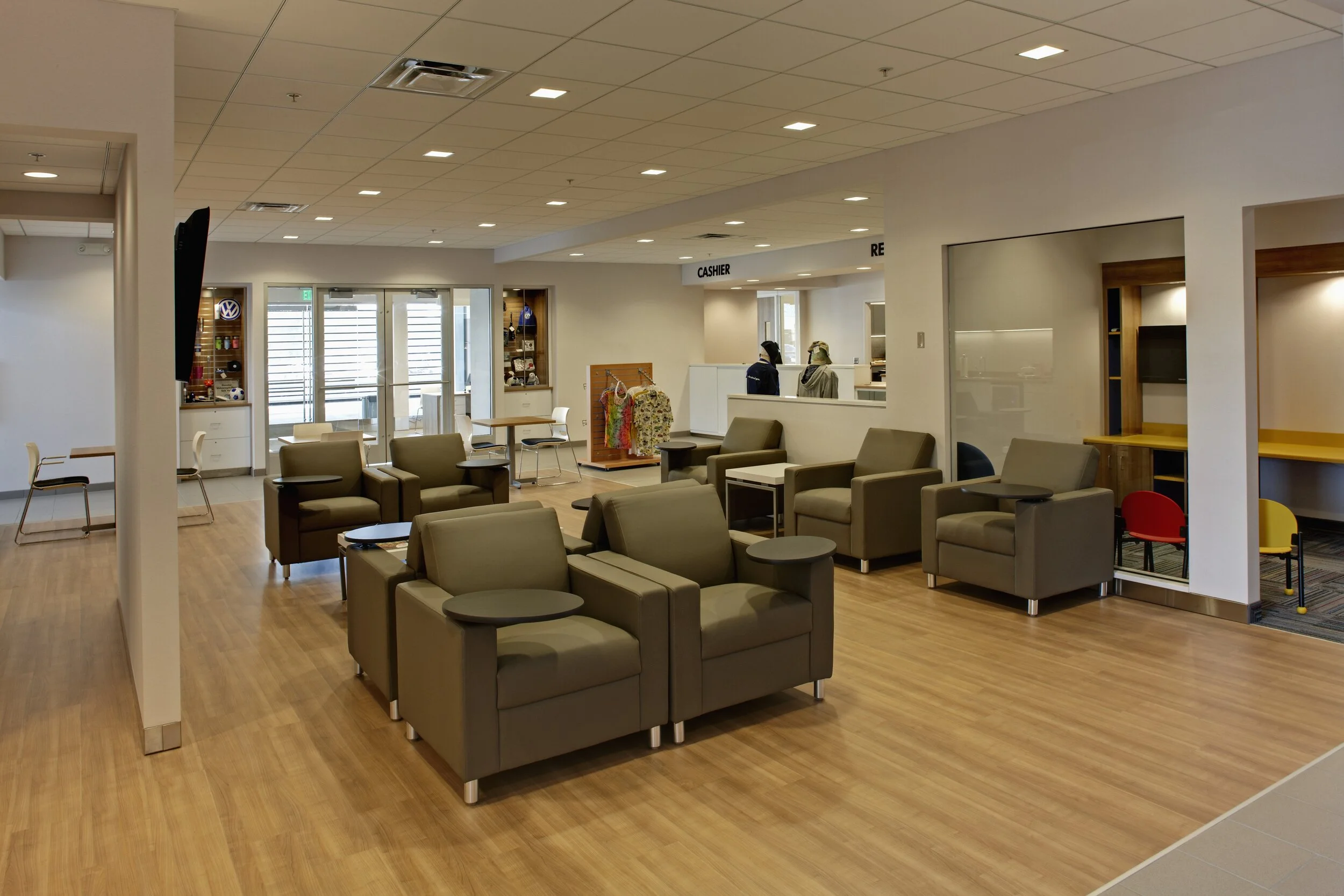 New car dealership facility including showroom, service department, service drive, and car wash bay.